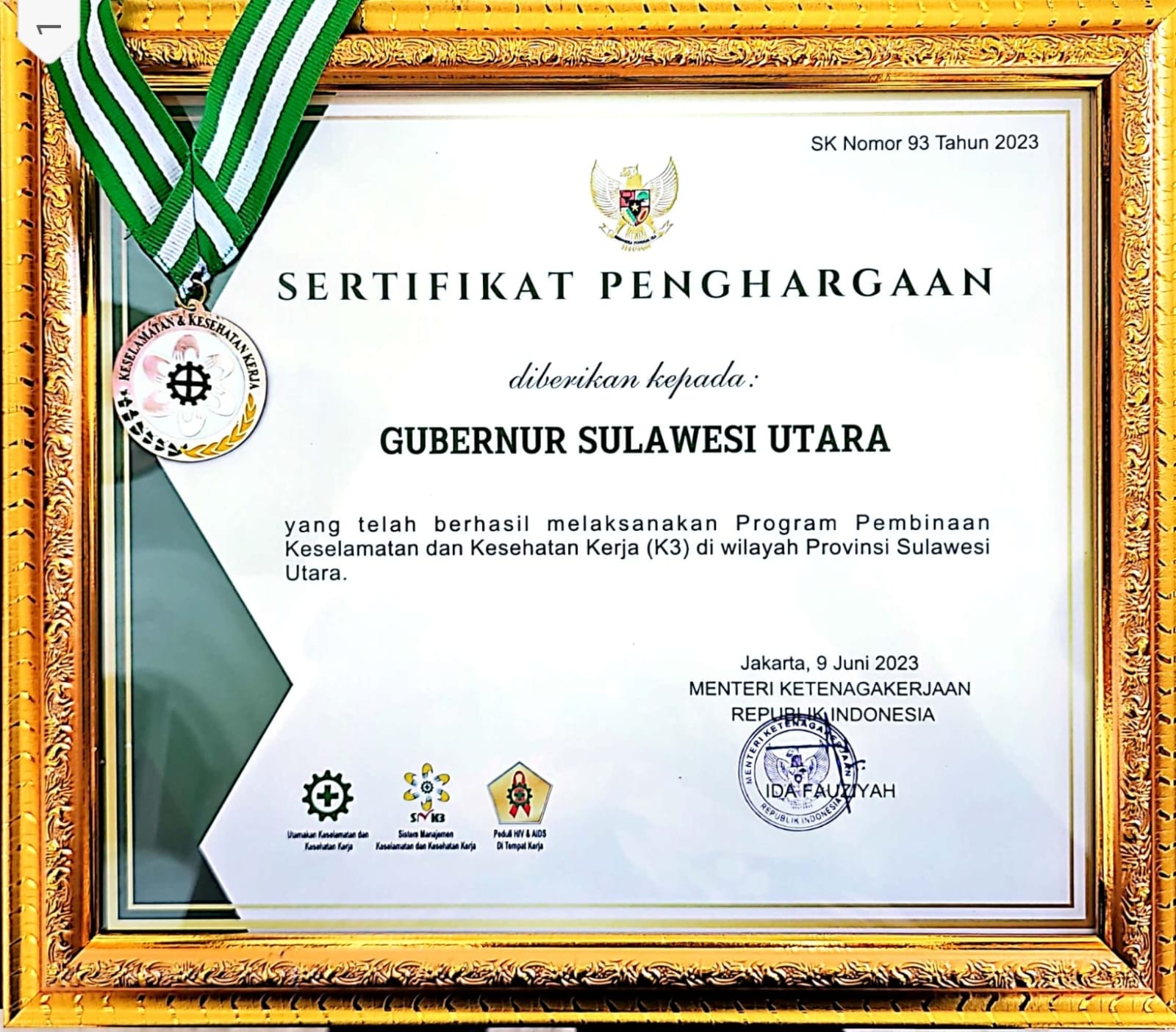 Penghargaan yang diterima Gubernur Olly, karena berhasil melakukan pembinaan terhadap perusahaan-perusahaan di Sulut, dengan kategori yang disyaratkan Kementerian Ketenagakerjaan.