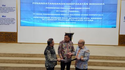 Bertempat di Kantor PT Taspen, Jakarta, Selasa (4/4/2023), Gubernur Olly Dondokambey, Direktur Utama PT Taspen A.N.S. Kosasih dan Dirut Bank SulutGo Revino Pepah melakukan penandatanganan kesepakatan bersama penyediaan hunian untuk ASN Pemprov Sulut yang belum memiliki rumah.