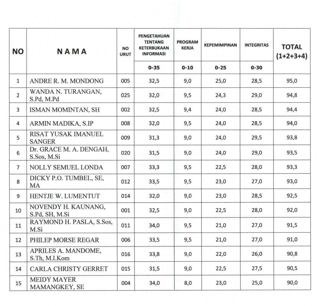 Ke 15 nama Calon Anggota KIP Sulut ini, selanjutnya akan diserahkan oleh Gubernur Sulut akan ke DPRD Provinsi Sulut untuk di tes kelayakan lebih lanjut atau “Fit n Propertes”.