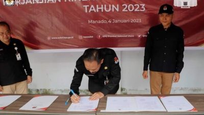 Manado, Exploresulut.com – Komisi Pemilihan Umum (KPU) Sulut melaksanakan apel perdana yang dirangkaikan dengan penandatanganan perjanjian kinerja dan pakta integritas, Rabu 4 Januari 2023, sebagai langkah untuk mengawali kerja di tahun ini.