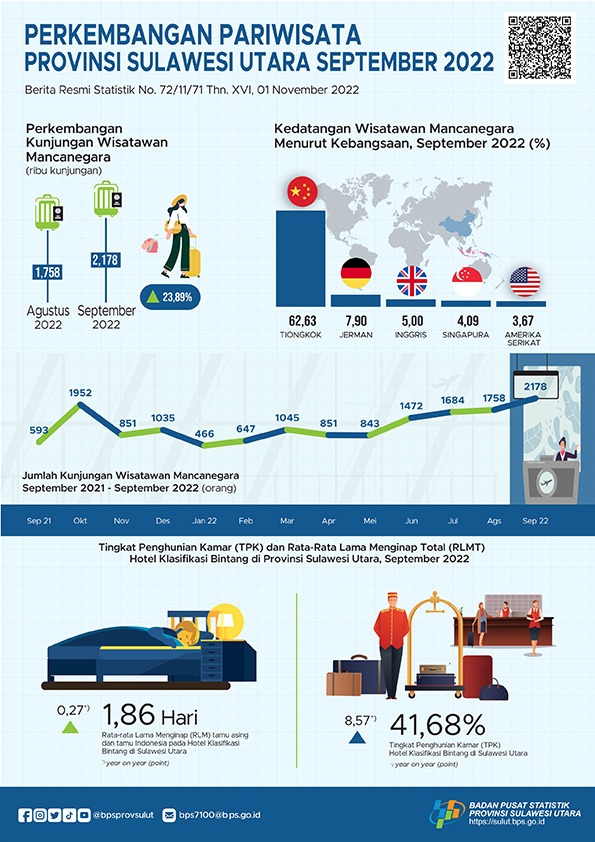 Jumlah Wisatawan Mancanegara (Wisman) yang datang ke Sulut melalui pintu masuk bandara Sam Ratulangi bulan September 2022 sebanyak 2.178 orang meningkat 23,89 persen dibanding bulan Agustus 2022 (M-to-M). Dibandingkan bulan September 2021, meningkat 267,28 persen (Y-on-Y).