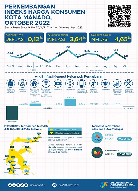 Perkembangan Indeks Harga Konsumen Kota (IHK) Manado bulan Oktober 2022, Kota Manado mengalami deflasi sebesar 0,12 persen, sedangkan inflasi tahun kalender sebesar 3,64 persen dan inflasi year on year sebesar 4,65 persen.