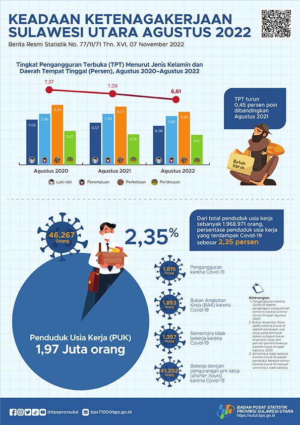 Tingkat Pengangguran Terbuka (TPT) Agustus 2022 sebesar 6,61 persen, turun sebesar 0,45 persen poin dibandingkan dengan Agustus 2021.